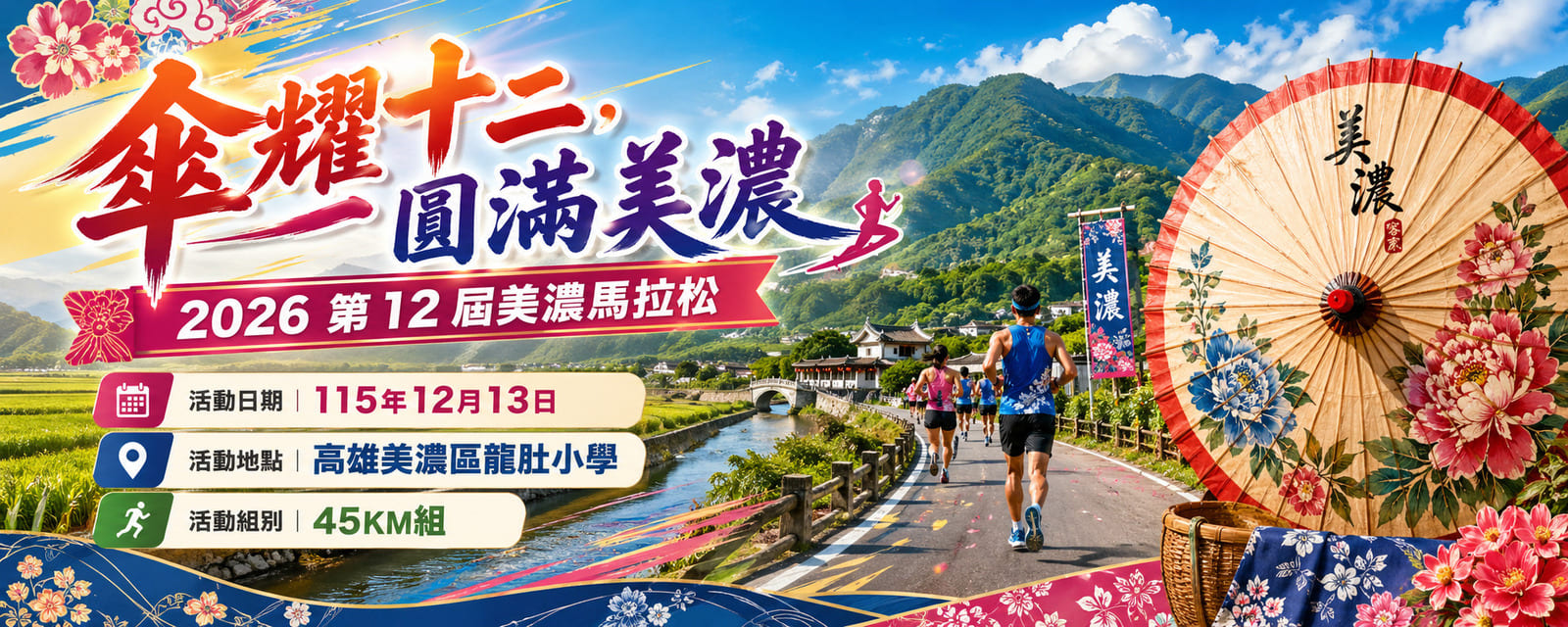 | 12/13(日) | 超級馬拉松 | 高雄市 | 【傘耀十二,圓滿美濃】2026 第 12 屆美濃馬拉松 | 高雄美濃區龍肚小學 |