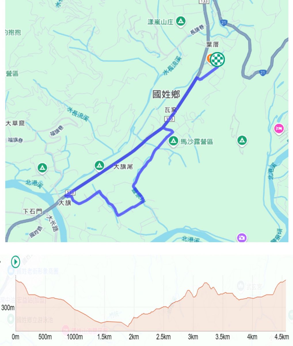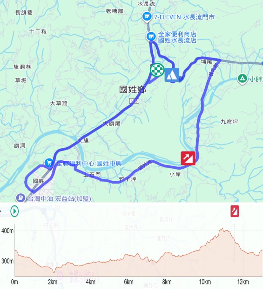 | 楞嚴宮(會場)集合出發➤左轉133線(0K+850)➤成功街(全聯)右轉➤中興路(成功雕像)➤左轉國姓路(國姓老街)➤鄉公所➤護國宮➤右轉國姓路➤(投84線)➤石門福德祠➤長北路➤左轉台21線(23K+700)➤台21線(21K+450)左轉133縣道(全家水長流店)➤133縣道(0K+850)明輝汽車修配廠左轉➤楞嚴宮(會場)➤完成賽事 |
