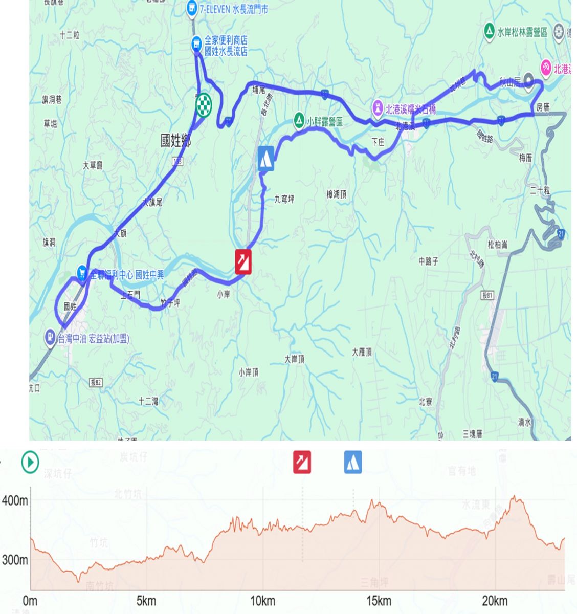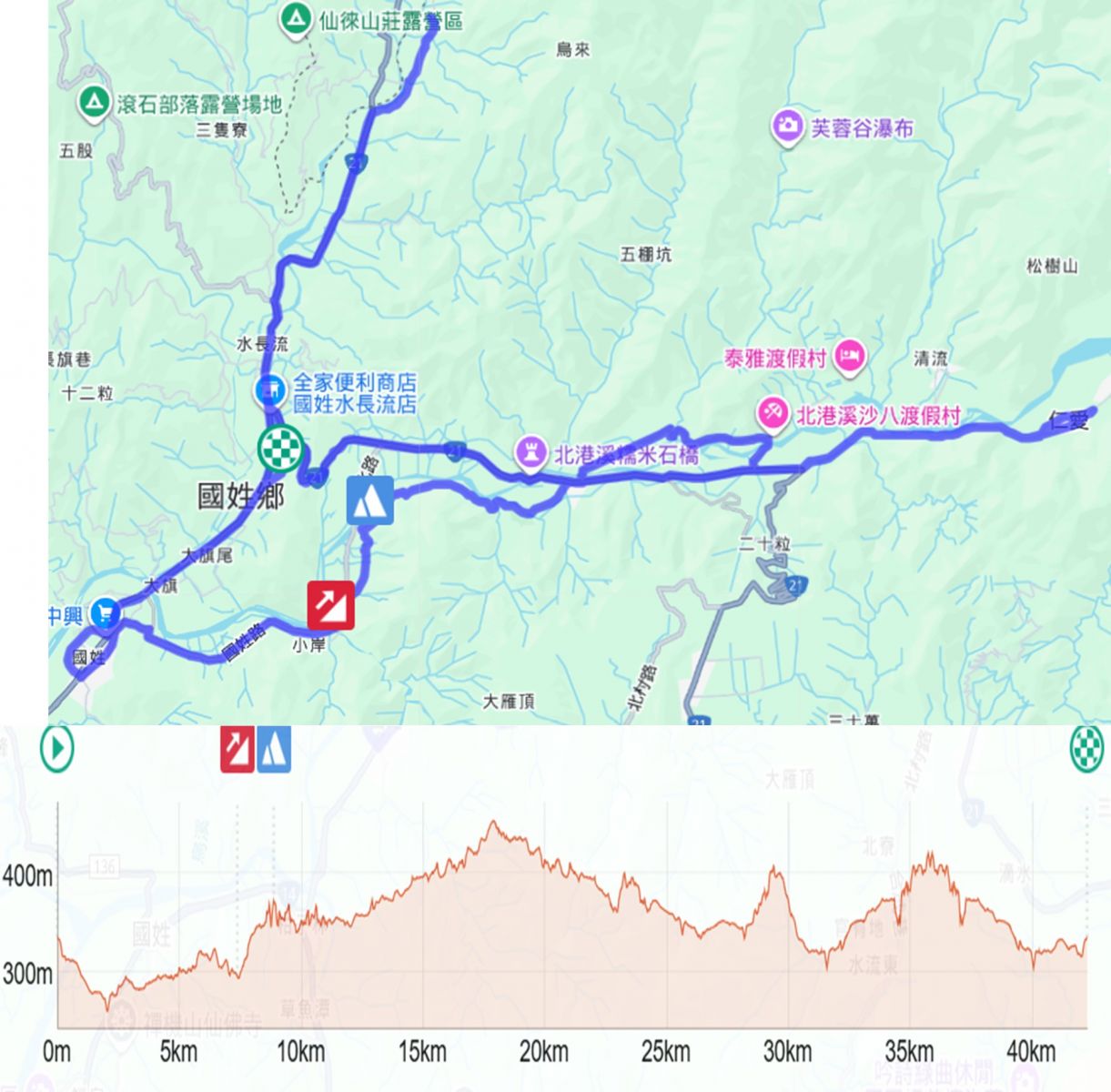 | 楞嚴宮(會場)集合出發➤左轉133線(0K+850)➤成功街(全聯)右轉➤中興路(成功雕像)➤左轉國姓路(國姓老街)➤鄉公所➤護國宮➤右轉國姓路➤(投84線)➤石門福德祠➤投84(3K+300岔路)右轉往小胖露營區➤台21線(26K+000)北港國小右轉➤梅林派出所直行➤台21線(28K+800)左轉北原路(投80線)➤中華路(投80線)➤中原部落三岔路右轉清流梅鄉自行車道➤中華路三岔路(投80線)左迴轉➤台21線(28K+800)右轉➤台21線北梅橋(28K+250)右轉北原路➤北圳巷左轉➤台21線梅林派出所右轉➤北港溪橋(糯米橋)➤台21線21km (21K+450)右轉水長流➤長春橋➤長福一號橋➤台21線(17K+500)富山商店右轉➤長雙橋路口右轉➤長雙巷39號折返➤左轉台21線(17K+500)富山商店➤長福一號橋-➤長春橋➤右轉133縣道(全家水長流店)➤133縣道(0K+850)明輝汽車修配廠左轉➤楞嚴宮(會場)完成賽事 |